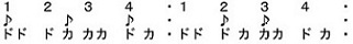 カナ譜例 1は「ドドドカ」の「ドドド」が3連符で「カ」が4分音符、同様に「カカドカ」の「カカド」が3連符で「カ」が4分音符です。