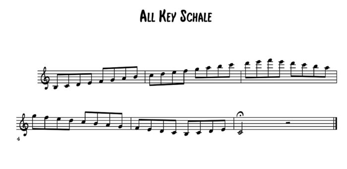 これはCのスケールはドから吹き始めると言う習慣をやめることに目的があります。Cのスケールは「ドから始まる音階」ではなく「調号(フラット、シャープの事)を持たない音階」つまり、すべてはナチュラルの音であるという事です。