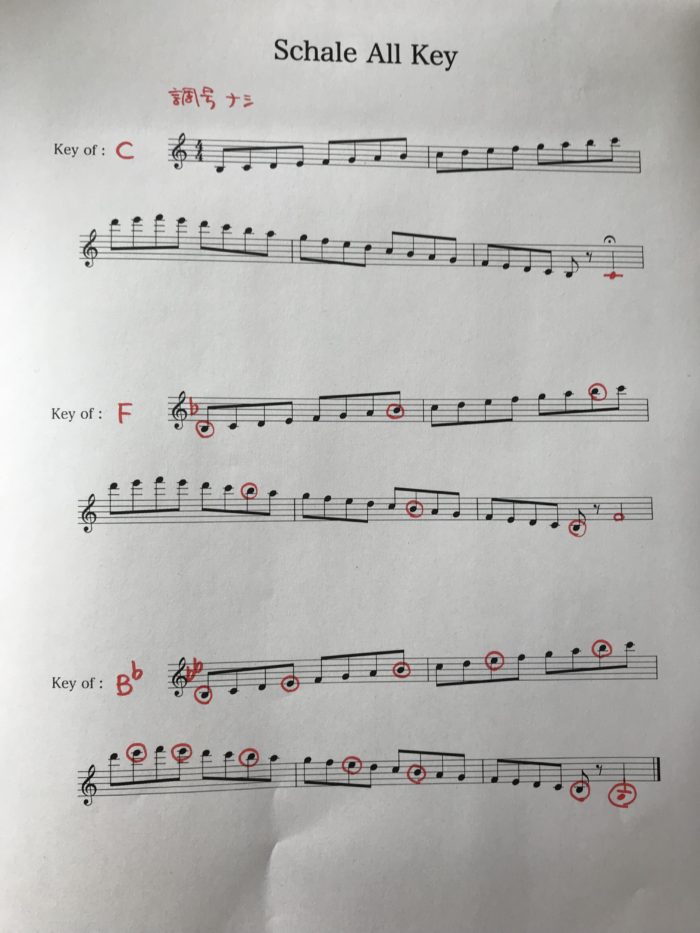 見やすくする為に赤ペンでフラット、シャープが付く音をマルで囲みました。1番最後に主音を書き込むのを忘れないで下さいね。