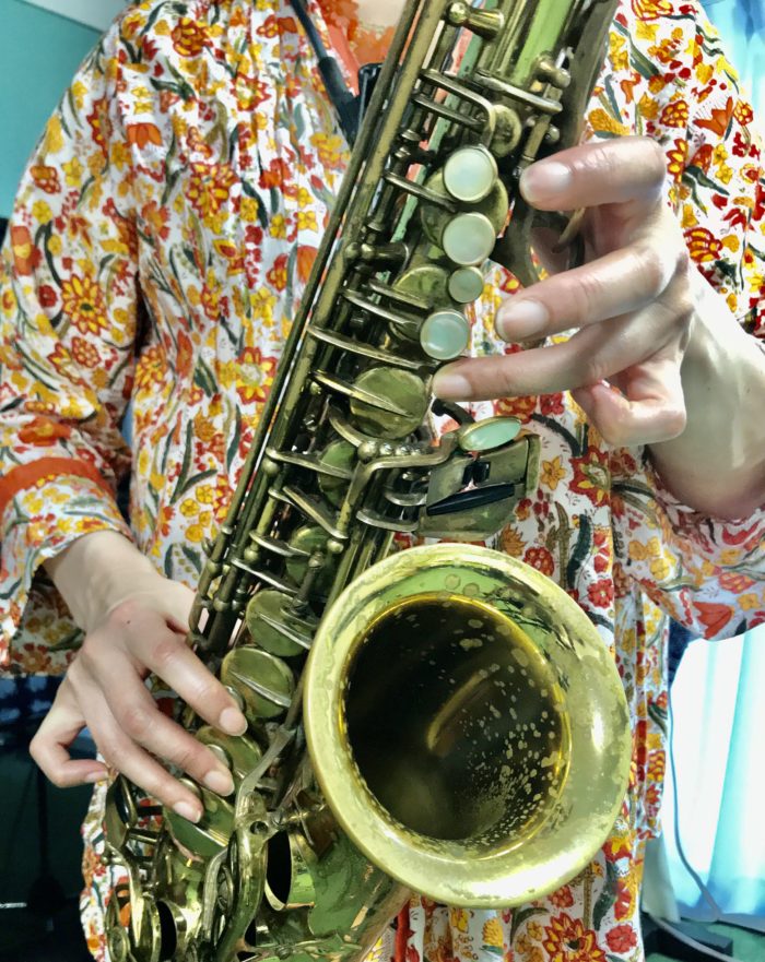 これは3小節目に出てくるフレーズで使います。このフレーズは全体を通して何度か出てきますので毎回使用してみて下さいね。このフィンガリングはとても便利で、左手さえこの形になっていれば右手は押さえていなくても、(または何を押さえても)開放のド#の音になる上に音程も良く、音色も安定します。必ずオクターブキィを押さえて下さい。もし押さえなかったら音程がとても低くなってしまします。